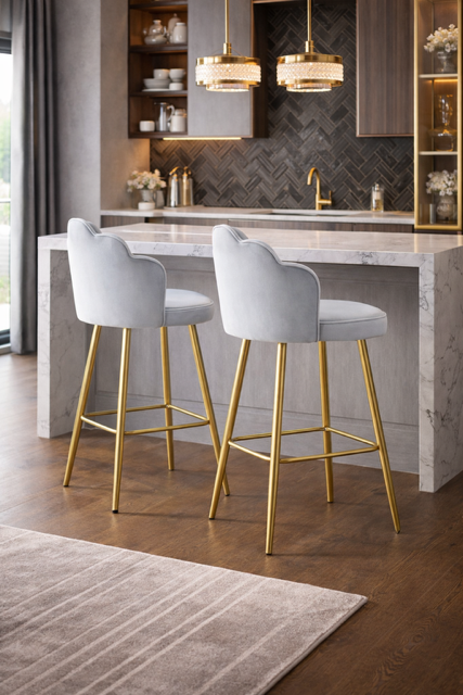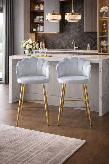Krzesło barowe hoker Shell Peacock aksamitny szary złoty