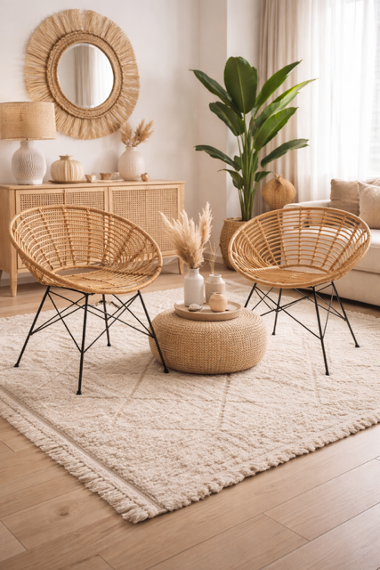 Krzesło Boho Rattanowe Mama doskonale wpisuje się w styl boho, który uwielbia naturalne materiały, organiczne kształty i bogactwo tekstur. Świetnie komponuje się z jasnymi, neutralnymi kolorami ścian, drewnianymi podłogami i roślinami, które ożywiają przestrzeń. Dzięki swojemu unikalnemu designowi, krzesło to może stać się centralnym punktem każdego wnętrza, nadając mu lekkość i swobodę. Równie dobrze sprawdzi się w stylach etnicznych, gdzie doda wnętrzu nieco egzotycznego charakteru, tworząc przestrzeń pełną inspiracji z różnych zakątków świata.