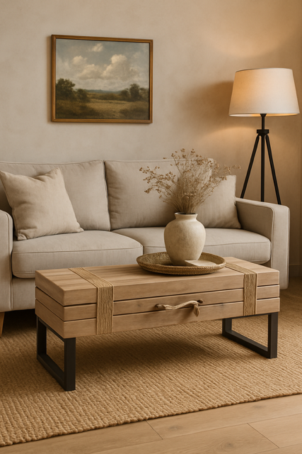 Dzięki solidnej konstrukcji z drewna jodły oraz metalowym elementom, stolik-skrzynia łączy w sobie trwałość z estetyką. Szuflada, wbudowana w jego strukturę, oferuje praktyczne miejsce na przechowywanie drobiazgów, zachowując jednocześnie porządek w Twoim salonie. Delikatne detale, takie jak naturalny sznur, podkreślają rustykalny charakter mebla, dodając mu jednocześnie wyjątkowego uroku.