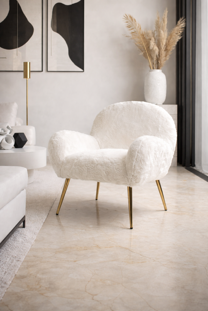 Ten fotel to prawdziwa oaza komfortu. Miękkie, puszyste futerko otula ciało niczym najdelikatniejszy koc, zachęcając do relaksu i odpoczynku po długim dniu. Dzięki złotym akcentom, Cozy Armchair emanuje elegancją i wyrafinowaniem, sprawiając, że każda chwila spędzona w jego towarzystwie nabiera wyjątkowego charakteru. Idealnie wpisuje się w kobiece, subtelne aranżacje, gdzie liczy się każdy, nawet najdrobniejszy detal.