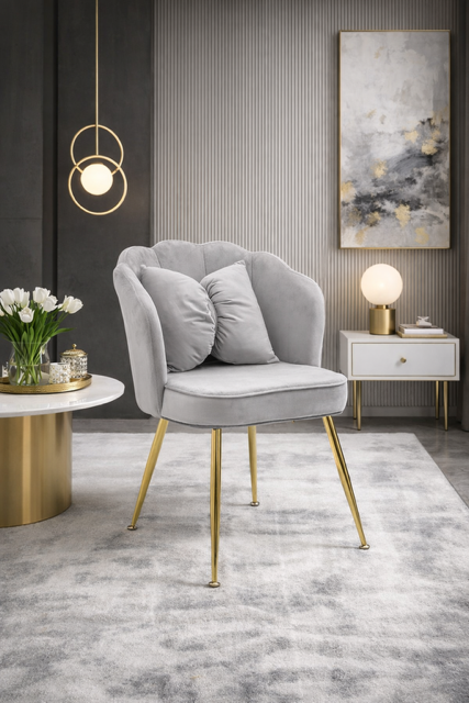 Szare krzesło z kokardą to kwintesencja subtelnej elegancji. Wykonane z miękkiego, aksamitnego materiału w eleganckim, stonowanym odcieniu szarości, natychmiast przyciąga uwagę. Jego zaokrąglone oparcie, przypominające płatki kwiatów, nadaje całości delikatności i wyjątkowego charakteru. Urocza kokarda, starannie wszyta w poduszkę, to niebanalny detal, który dodaje krzesłu unikalnego uroku, czyniąc je niepowtarzalnym elementem każdej aranżacji. Smukłe, złote nogi to kropka nad "i", dodająca mu blasku i szyku.