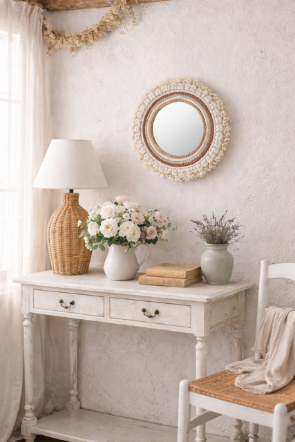 Lustro Boho Plecione to element, który z łatwością odnajdzie się w różnych stylach wnętrzarskich. W przestrzeniach boho doskonale współgra z naturalnymi tkaninami, drewnem i roślinami, tworząc harmonijną, spokojną kompozycję. W stylu rustykalnym wprowadza dodatkową warstwę tekstur, idealnie komponując się z drewnianymi meblami i ciepłymi kolorami. Z kolei w nowoczesnych wnętrzach może stanowić ciekawy, kontrastowy element, który ożywi surowe formy i minimalistyczne aranżacje. Świetnie sprawdzi się w salonie, sypialni czy przedpokoju, nadając przestrzeni wyjątkowego charakteru.