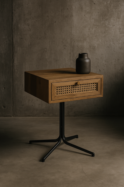 Stolik nocny z plecionką wiedeńską to połączenie nowoczesnego designu z klasycznymi akcentami, które przyciąga wzrok i nadaje wnętrzu niepowtarzalny charakter. Wykonany z solidnego drewna oraz wspartego metalową podstawą, łączy w sobie trwałość i estetykę. Rattanowy front szuflady przyciąga uwagę, ale także dodaje naturalnego uroku, idealnie wpisując się w trendy współczesnego wzornictwa. To mebel, który z pewnością stanie się ozdobą Twojego domu.