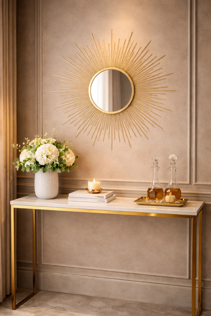 Lustro Słońce Złote świetnie odnajdzie się w luksusowych wnętrzach glamour, gdzie blask i elegancja odgrywają główną rolę. Złote promienie wprowadzą do pomieszczenia elegancki i wyrafinowany akcent, który doskonale współgra z aksamitnymi tkaninami, kryształowymi lampami czy marmurowymi elementami. W nowoczesnych aranżacjach lustro stanie się dekoracyjnym kontrapunktem dla minimalistycznych form i chłodniejszych barw, dodając wnętrzu ciepła i oryginalnego wyrazu. W przestrzeniach eklektycznych, jego wyrazista forma i złote wykończenie będą idealnie współgrały z różnorodnymi fakturami i materiałami, tworząc wyjątkowy, artystyczny efekt. Lustro Słońce Złote to idealny dodatek do salonu, sypialni czy jadalni, gdzie nada przestrzeni wyjątkowego blasku.