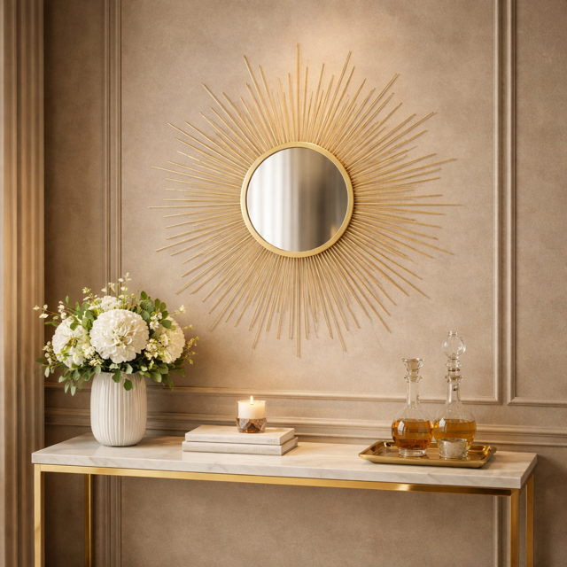 Rama lustra wykonana jest z metalu pokrytego złotym wykończeniem, co nadaje całości luksusowego wyglądu, a jednocześnie gwarantuje wytrzymałość na lata. Metalowe promienie są precyzyjnie ułożone, co tworzy harmonijny, symetryczny wzór, dodając wnętrzu odrobinę ekstrawagancji. Zastosowanie trwałych materiałów zapewnia, że lustro jest estetyczne, ale także solidne.