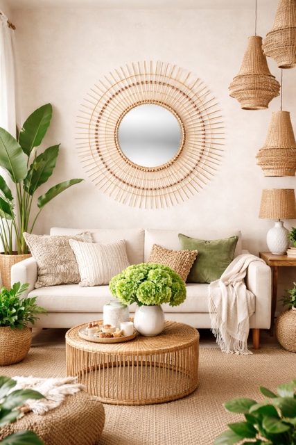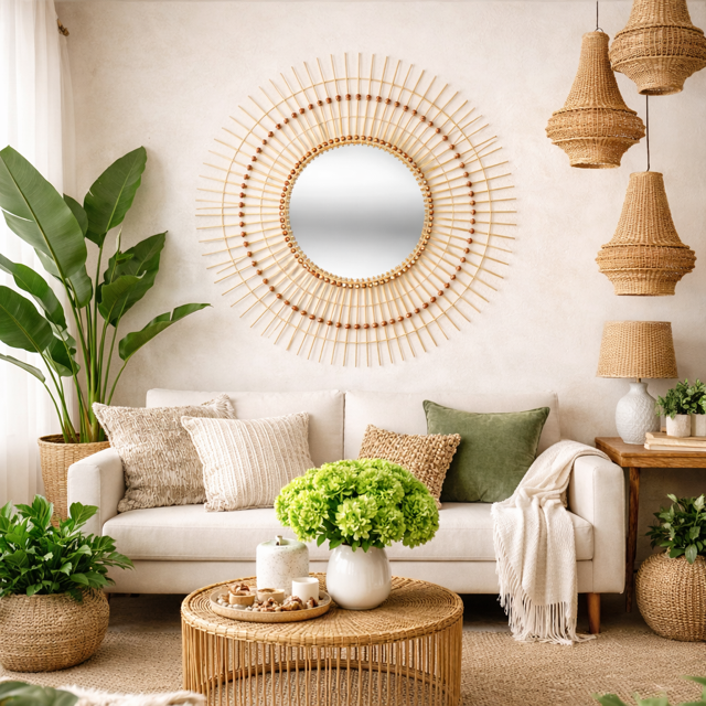 Lustro ma średnicę 76,5 cm, a samą taflę lustra o średnicy 36,5 cm otacza oryginalna oprawa wykonana z naturalnego bambusa. Drobne perełki dodają mu luksusowego charakteru, podkreślając jego dekoracyjny potencjał. Niezwykłe połączenie naturalnych materiałów z delikatnymi ozdobami sprawia, że lustro to staje się harmonijnym dodatkiem do przestrzeni, w której króluje styl i funkcjonalność.