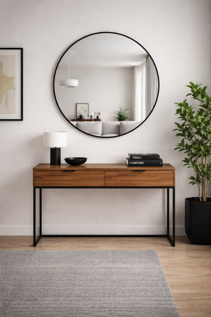 Lustro Okrągłe Czarne doskonale odnajdzie się w przestrzeniach urządzonych w stylu nowoczesnym, gdzie prostota i funkcjonalność są na pierwszym miejscu. W industrialnych i loftowych wnętrzach jego czarna, metalowa rama świetnie współgra z surowymi materiałami, takimi jak beton, stal i cegła, tworząc harmonijną całość. W minimalistycznych przestrzeniach doda subtelnego, lecz wyrazistego charakteru, idealnie współgrając z neutralnymi barwami i prostymi formami mebli. Świetnie sprawdzi się zarówno w salonie, przedpokoju, jak i w łazience, gdzie jego prosta elegancja wprowadzi do wnętrza nowoczesny, stylowy akcent.