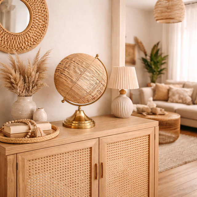 Globus rattanowy Boho doskonale sprawdzi się w różnorodnych aranżacjach wnętrz. Wprowadza do przestrzeni elementy boho, które łączą w sobie luźny styl, naturalne materiały oraz egzotykę. Dzięki swojej neutralnej kolorystyce, idealnie komponuje się z ciepłymi barwami, drewnianymi meblami oraz zielenią roślin doniczkowych. Sprawdzi się zarówno w przestrzeniach nowoczesnych, jak i klasycznych, wnosząc do nich powiew świeżości i oryginalności. Postaw go w salonie, gdzie stworzy przytulny kącik, lub w biurze, aby dodać mu charakteru. Globus stanie się nie tylko elementem dekoracyjnym, ale również punktem wyjścia do rozmów o podróżach i przygodach.