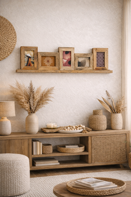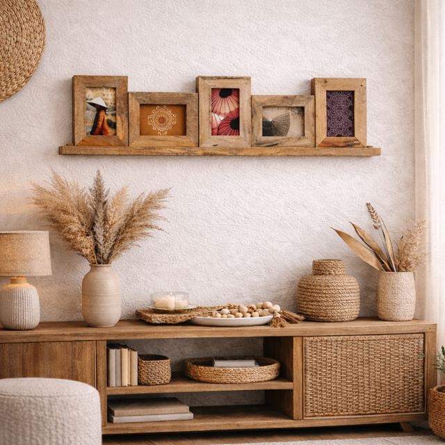 Półka z ramkami to nie tylko funkcjonalny element, ale także doskonała dekoracja, która może być dopasowana do różnych stylów aranżacyjnych. W zestawieniu z dodatkami w kolorach ziemi, takich jak zielenie czy beże, półka podkreśli atmosferę harmonii i spokoju. W połączeniu z industrialnymi akcentami, na przykład metalowymi lampami czy surowymi cegłami, stworzy ciekawy kontrast, dodając nowoczesnego charakteru. Drewno mango, z którego jest wykonana, wprowadza do wnętrza ciepło oraz elegancję, co sprawia, że jest to idealny wybór do każdego stylowego domu.