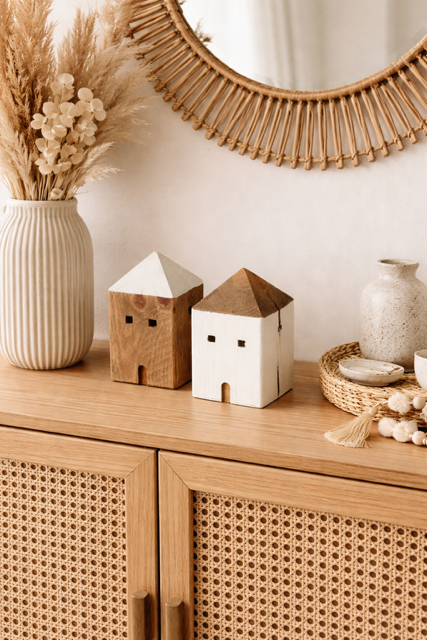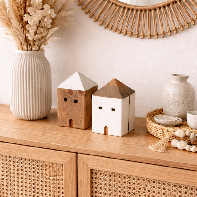 Zestaw drewnianych domków Jordi High to nie tylko piękno i prostota, ale także wyraz troski o środowisko. Wykonane z drewna z recyklingu, te urocze dekoracje łączą w sobie naturalny charakter i nowoczesne podejście do zrównoważonego designu. Każdy domek nosi unikatowe ślady swojego poprzedniego życia — delikatne ślady użytkowania, naturalne zarysowania i zróżnicowane faktury drewna, co dodaje mu niepowtarzalnego charakteru. Ich minimalistyczna forma wprowadza harmonię i przytulność do każdego wnętrza, tworząc idealne miejsce do wyeksponowania ulubionych dodatków.