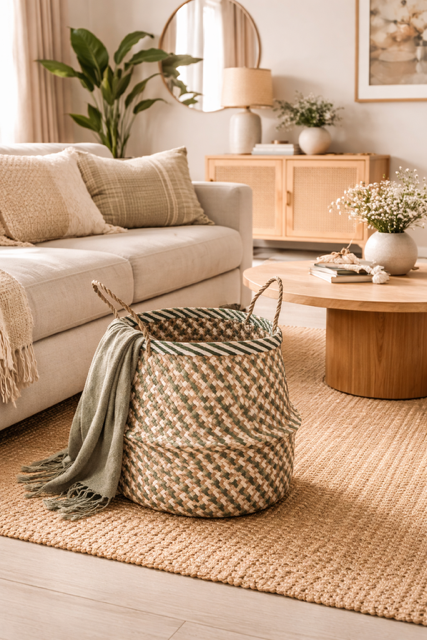 Kosz Boho w zielonym odcieniu świetnie odnajdzie się w przestrzeniach urządzonych w stylu boho, wprowadzając harmonię i bliskość natury. Zielona barwa kojarzy się z spokojem i harmonią, co czyni go idealnym do wnętrz, które mają emanować przytulnością i naturalnością. W stylu skandynawskim, pełnym jasnych kolorów i prostoty, kosz stanie się akcentem dodającym życia i kontrastu. W nowoczesnych, minimalistycznych wnętrzach kosz Boho doda lekkości i naturalnej elegancji. To doskonały wybór do salonu, sypialni czy łazienki, gdzie można go używać zarówno jako dekoracyjny akcent, jak i miejsce do przechowywania poduszek, koców czy akcesoriów.