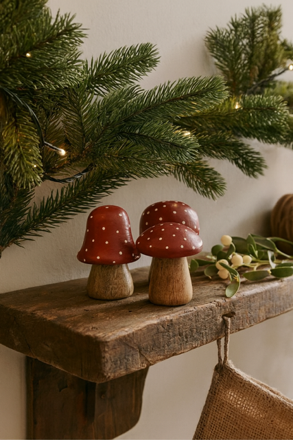 Trzy urokliwe, malowane ręcznie czerwone grzybki, które wprowadzą do wnętrza magiczną atmosferę. Zestaw został wykonany z drewna mango, co czyni je eleganckim dodatkiem do każdego pomieszczenia. Ustaw je w gronie roślin doniczkowych, na parapecie lub ulubionej komodzie i ciesz się ich urokiem cały rok. Zestaw stanowi również rewelacyjną dekorację na Boże Narodzenie. Ustawione na blacie kuchennym, regale łazienkowym, na szafce nocnej, stoliku w salonie lub przy choince, szybko staną się ozdobą, z którą nie będziesz chciał się rozstać. W zestawieniu z koszem boho lub drewnianą donicą, będą budzić zachwyt wśrod wszystkich, którzy odwiedzą Twoje cztery kąty.