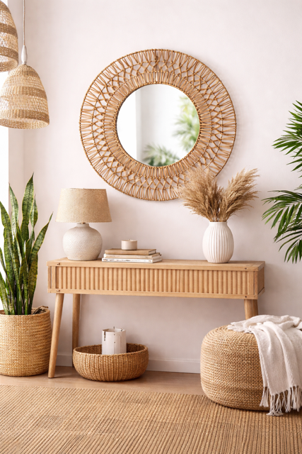 Lustro rattanowe "Milou" to must-have dla każdego miłośnika stylu boho, gdzie naturalne materiały królują, tworząc atmosferę luzu i swobody. Świetnie sprawdzi się również w stylach skandynawskich, gdzie jego naturalna faktura ożywi minimalistyczne aranżacje, a jasne, rattanowe plecionki nadadzą wnętrzom ciepła. W przestrzeniach eklektycznych lustro "Milou" doda uroku i będzie stanowiło harmonijny kontrast do bardziej nowoczesnych, industrialnych elementów.