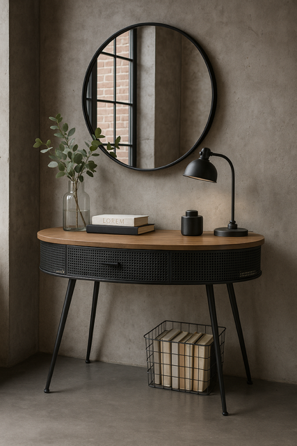 Konsola Fashion Bottle znakomicie wpasuje się w aranżacje wnętrz w stylu industrialnym, loftowym oraz retro. W stylu industrialnym, jej surowa metalowa konstrukcja doskonale współgra z betonowymi lub ceglanymi ścianami, tworząc spójną i stylową przestrzeń. W loftowych wnętrzach konsola może być uzupełnieniem surowych mebli, takich jak metalowe regały czy skórzane fotele, nadając pomieszczeniu nowoczesny, a zarazem przytulny charakter. W stylu retro, plecionka wiedeńska i ciepły odcień blatu świetnie współgrają z tapetami w stylu vintage oraz drewnianymi, klasycznymi meblami, tworząc nostalgiczne, ale zarazem świeże wnętrze.