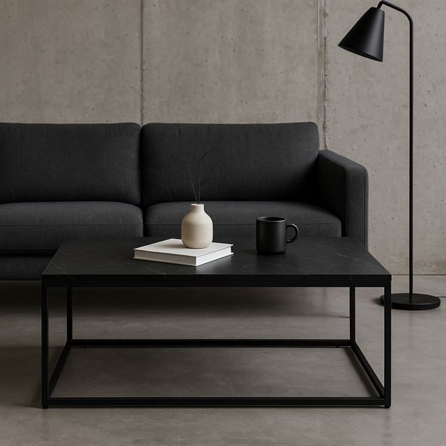 Stolik doskonale odnajdzie się w nowoczesnych, minimalistycznych przestrzeniach, gdzie królują proste formy i stonowane barwy. Jego uniwersalny, czarny kolor w połączeniu z marmurowym blatem sprawia, że idealnie pasuje do jasnych ścian, szczególnie w odcieniach bieli, szarości lub beżu. W towarzystwie innych mebli o podobnym wykończeniu, jak metalowe półki czy skórzane sofy, stworzy spójną i harmonijną aranżację. Dodatki w postaci delikatnych roślin lub designerskich lamp dodatkowo podkreślą jego nowoczesny charakter.