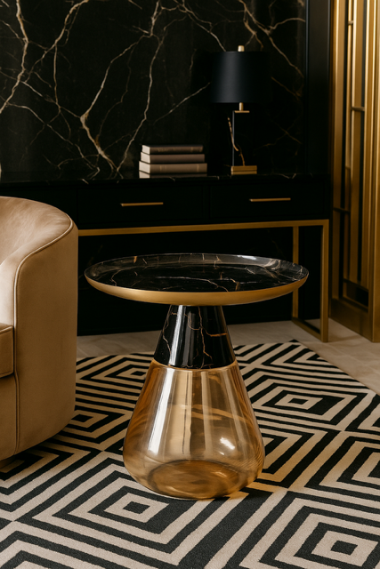 Stolik Bottle Marmur Czarny to idealny wybór dla wnętrz urządzonych w stylu glamour, art deco, a także nowoczesnym. Jego wyrafinowany wygląd świetnie wpisuje się w luksusowe aranżacje, dodając im elegancji i nieco tajemniczego charakteru. Doskonale sprawdzi się w salonach, eleganckich gabinetach, a także w stylowych hotelach czy biurach. Marmurowy blat przyciąga wzrok i wprowadza do przestrzeni niepowtarzalny akcent, który odmienia każde wnętrze.