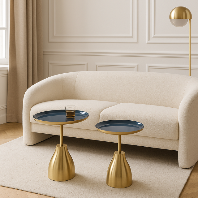 Oto zestaw dwóch metalowych stolików, które łączą w sobie elegancję złota z głębokim niebieskim odcieniem. Ich unikalny design wyróżnia się subtelnym kształtem oraz delikatnymi akcentami, które przyciągają wzrok i dodają charakteru każdemu wnętrzu. Górne blaty o idealnie gładkiej powierzchni są estetyczne, ale także praktyczne, zapewniając odpowiednią przestrzeń do eksponowania dekoracji czy serwowania napojów.