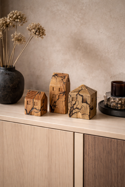 Te drewniane domki będą doskonałym uzupełnieniem półki, stołu lub biurka, wprowadzając do przestrzeni ciepły i przytulny nastrój. Dzięki swojej uniwersalnej kolorystyce pasują do wielu innych elementów wystroju wnętrz, szczególnie tych, w których dominuje drewno, beton czy kamień, tworząc harmonijną i ponadczasową aranżację.