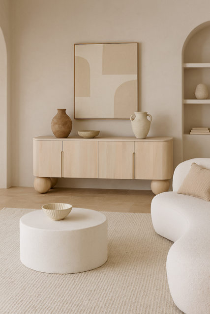 Niezwykle rozbudowany design tej komody jest widoczny we wszelkich detalach. Solidne nogi kule wykonane z najwyższej jakości drewna nadają meblowi lekkości i unikalnego charakteru, jednocześnie zapewniając stabilność. Komoda Japandi RTV zachwyca swoim minimalistycznym podejściem, które idealnie wpisuje się w zasady stylu Japandi, łączącego japońską prostotę z nordycką funkcjonalnością.