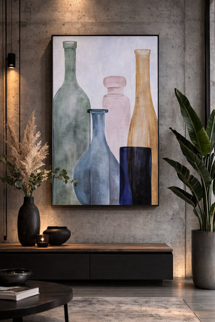 Obraz Bottles doskonale komponuje się z wnętrzami w stylu nowoczesnym, minimalistycznym i eklektycznym. W salonie będzie główną dekoracją ściany, dodając przestrzeni elegancji i nowoczesności. W jadalni wprowadzi artystyczny akcent, podkreślając indywidualny styl. W biurze lub gabinecie podkreśli profesjonalizm i kreatywność, inspirując do twórczej pracy. Jego neutralna kolorystyka i wyraziste wzornictwo sprawiają, że łatwo wpasuje się w różnorodne palety barw i tekstur, dodając wnętrzom głębi i stylu.