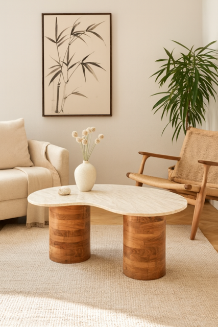 Ława Japandi Marmur Drewno Mango doskonale wpisuje się w różnorodne style wnętrzarskie: