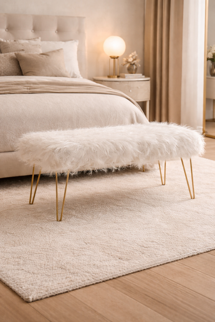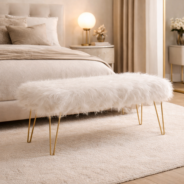 Puf Złoty Ławka z Białym Futerkiem to połączenie elegancji i wygody, które wniesie do twojego wnętrza odrobinę luksusu. Siedzisko pokryte miękkim, białym futerkiem emanuje delikatnością i przytulnością, a jego puszysta struktura zaprasza do odpoczynku. Złote, metalowe nogi dodają meblowi wyrafinowanego stylu, tworząc harmonijną całość, która przyciąga wzrok i dodaje przestrzeni blasku.