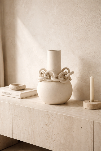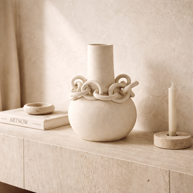 Wazon Ceramiczny Chain 30 cm idealnie pasuje do nowoczesnych, minimalistycznych oraz industrialnych wnętrz. W salonie może pełnić funkcję centralnej ozdoby na stoliku kawowym lub komodzie, dodając elegancji i współczesnego stylu. W sypialni wprowadzi spokojny, harmonijny nastrój, a w jadalni podkreśli wystrój stołu. Jego uniwersalny design sprawia, że łatwo dopasuje się do różnych palet kolorystycznych i stylów aranżacyjnych.
