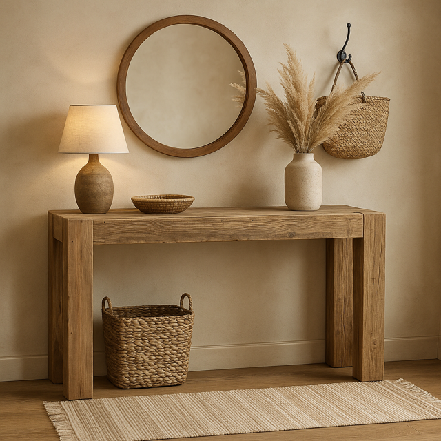 Konsola z drewna z recyklingu doskonale wpisuje się w różnorodne style aranżacyjne, od industrialnego, poprzez rustykalny, aż po skandynawski. Jej surowy, ale jednocześnie ciepły wygląd sprawia, że wspaniale komponuje się z wnętrzami o stonowanej kolorystyce. Idealnie prezentuje się na tle białych lub jasnoszarych ścian, gdzie jej naturalne drewno stanowi wyrazisty akcent. Wnętrza urządzone w stylu loftowym wzbogaci swoją surowością, a w bardziej klasycznych aranżacjach doda im przytulności. Konsola będzie również świetnie wyglądać w towarzystwie innych mebli z drewna, takich jak rustykalne stoły, regały z naturalnych materiałów, czy skórzane fotele. W zestawieniu z dodatkami z metalu lub kamienia, stworzy harmonijną całość, nadając wnętrzu charakteru i głębi.