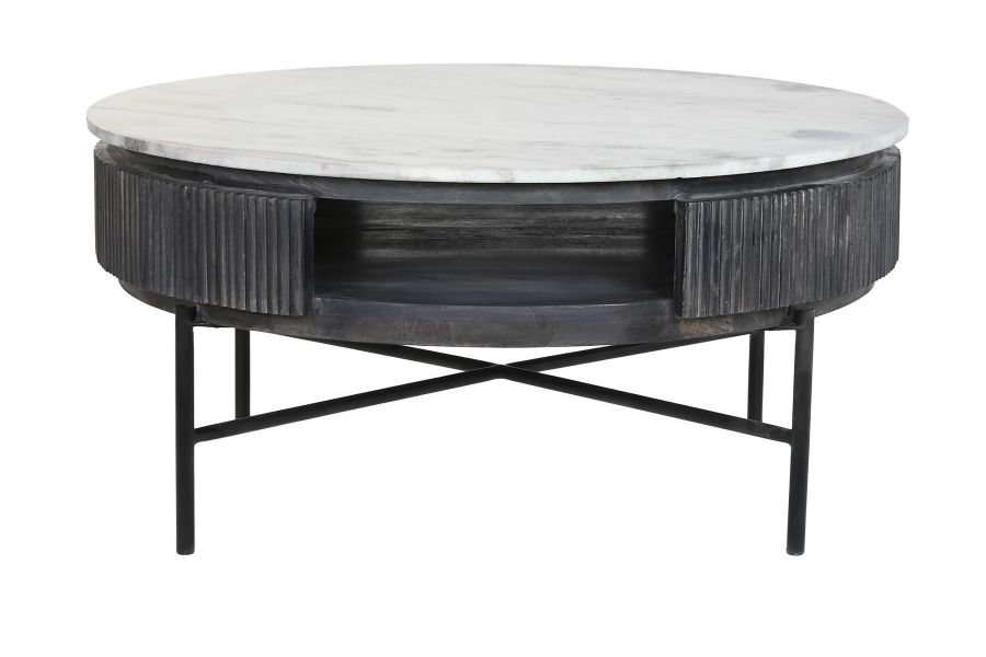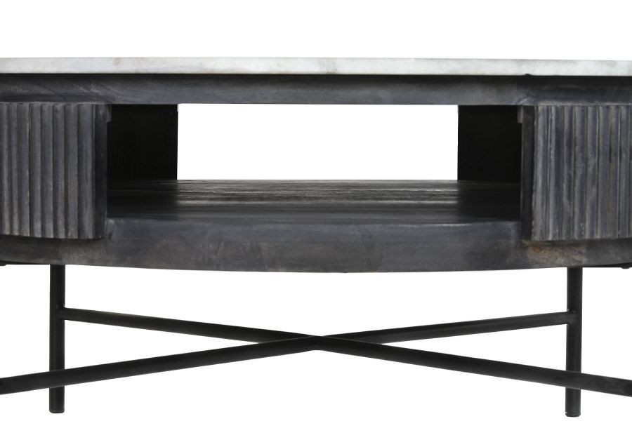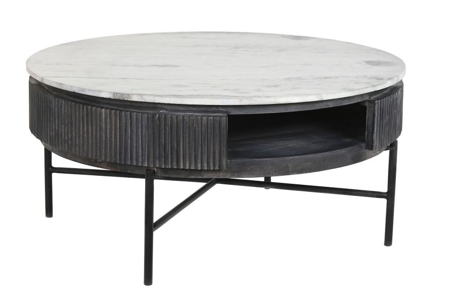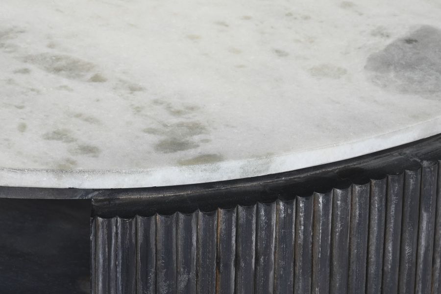Okrągła ława drewniana z marmurowym blatem i lamelami w kolorze czarnym to esencja nowoczesnej elegancji, wzbogaconej o surowość industrialnego stylu. Dzięki unikalnemu połączeniu naturalnego drewna mango, chłodnego marmuru oraz solidnej metalowej podstawy, mebel przyciąga wzrok, ale także wprowadza do wnętrza odrobinę artystycznej ekstrawagancji. Idealna do przestronnych, loftowych aranżacji, ale równie dobrze odnajdzie się w bardziej klasycznych przestrzeniach, gdzie stanie się centralnym punktem salonu.
