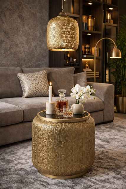 Ten wyjątkowy stolik idealnie wkomponuje się w różnorodne aranżacje wnętrz. Świetnie sprawdzi się w eleganckich salonach, gdzie podkreśli klasyczny styl, a także w nowoczesnych przestrzeniach, dodając im niepowtarzalnego charakteru. Dzięki swojej złotej kolorystyce, stolik z łatwością zharmonizuje się z ciemnymi odcieniami, takimi jak granat czy butelkowa zieleń, tworząc wyrazisty kontrast. Może stać się centralnym punktem w minimalistycznych aranżacjach, jak również doskonałym uzupełnieniem eklektycznych przestrzeni, w których klasyka spotyka się z nowoczesnością. Jego uniwersalny styl sprawia, że pasuje do wnętrz w stylu glamour, art deco, czy nawet boho, wprowadzając do nich elegancję i szyk.
