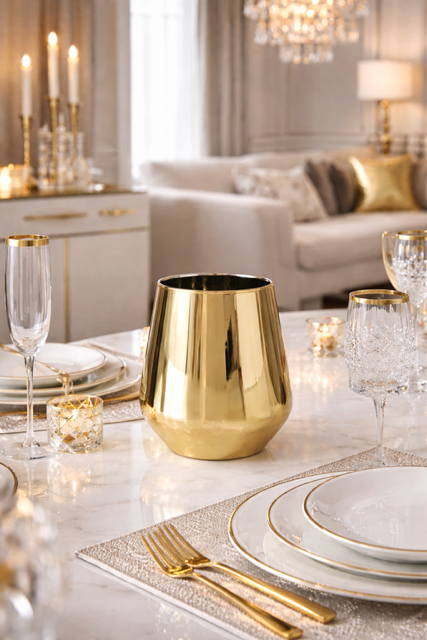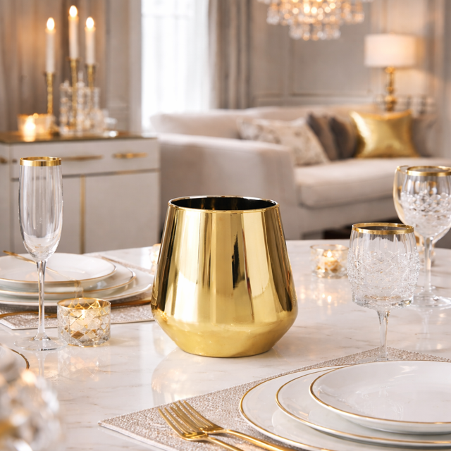 Złota szklanka to doskonały dodatek do wnętrz w stylu glamour, nowoczesnym czy minimalistycznym. Jej lustrzany blask wspaniale komponuje się z ciemnymi elementami wyposażenia, jak również kontrastuje z jasnymi akcentami, nadając przestrzeni świeżości i elegancji. Świetnie sprawdzi się zarówno w jadalni, jak i w salonie podczas uroczystych kolacji, dodając prestiżowego akcentu każdemu spotkaniu.