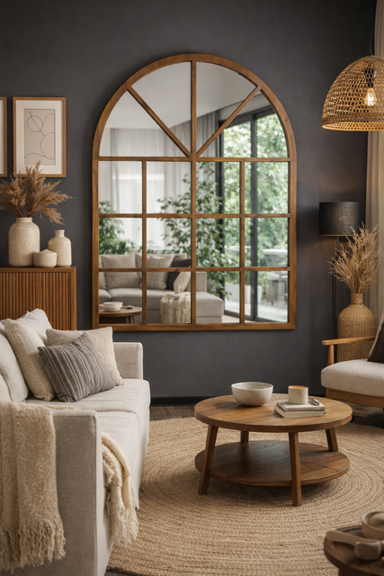 Lustro swoim kształtem i układem przypomina okno z Wenecji. Jego zaokrąglona góra oraz podział na prostokątne sekcje odzwierciedlają charakterystyczną formę okien, które można spotkać w tradycyjnej architekturze weneckiej. Taki design nadaje lustrze elegancji oraz klasycznego uroku, idealnie pasując do wnętrz, które łączą historyczny styl z nowoczesnymi akcentami. Zaokrąglona rama wykonana z naturalnego drewna świerkowego przypomina architektoniczne arcydzieła Wenecji, gdzie okna były nie tylko funkcjonalnym elementem, ale także wyrazem artystycznej wrażliwości. Lustro w tej formie, z przemyślanym podziałem dodaje wnętrzu głębi i optycznie je powiększa, wprowadzając jednocześnie ciepło drewna. To idealne rozwiązanie dla osób, które pragną połączyć klasyczny, rustykalny charakter z nowoczesnym wyrafinowaniem, nadając swojemu domowi niepowtarzalnego uroku inspirowanego wenecką architekturą.
