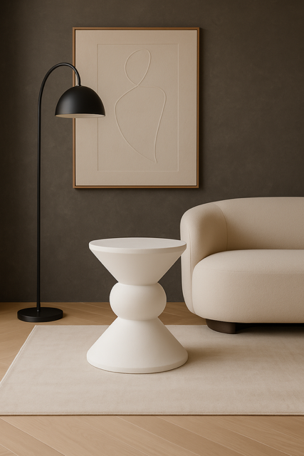 Oryginalna forma i ponadczasowa biel czynią stolik Klepsydra wyjątkowym dodatkiem, który wprowadza do wnętrza lekkość i harmonię. Nietypowy kształt inspirowany klepsydrą nadaje mu artystycznego charakteru, sprawiając, że pełni on nie tylko funkcję praktyczną, ale również dekoracyjną.