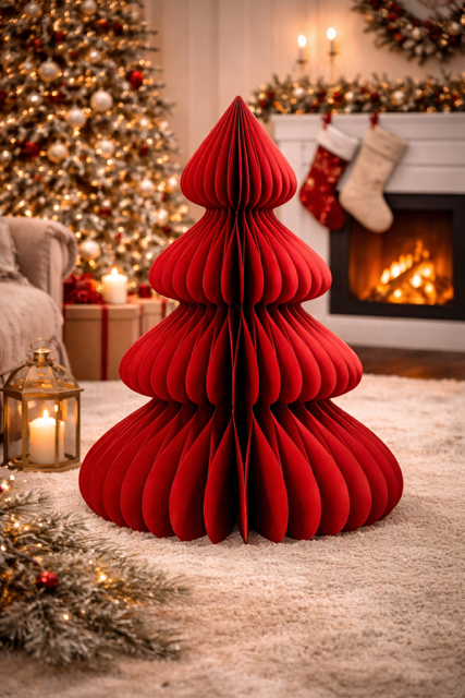 Geometryczny kształt inspirowany techniką origami nadaje tej choince wyrazistego i współczesnego charakteru. Dzięki składanej konstrukcji jest łatwa do przechowywania i wielokrotnego wykorzystania. Intensywny czerwony kolor wprowadza radosny nastrój, przywodząc na myśl klasyczne świąteczne dekoracje w świeżym, odświeżonym wydaniu.