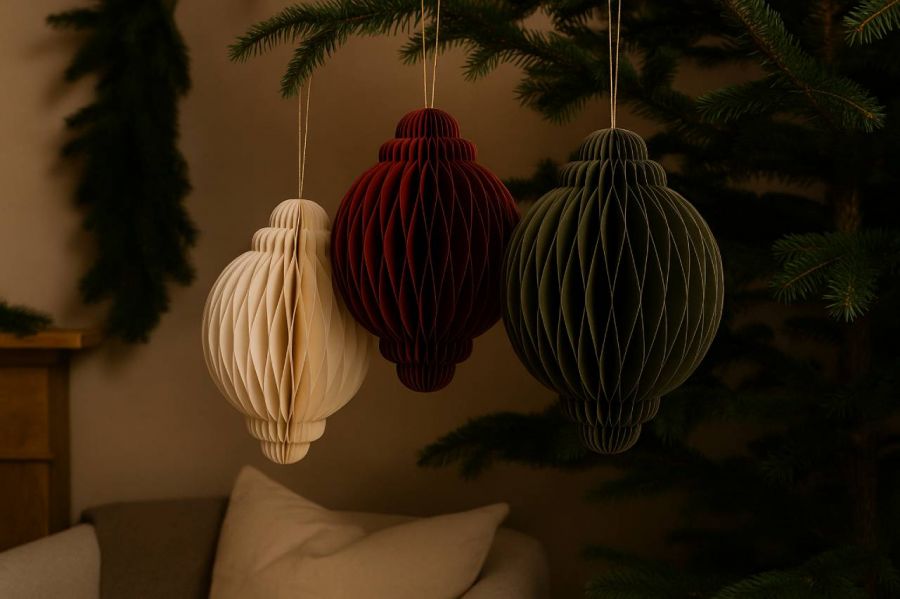 Biała bombka papierowa o składanej formie wprowadza do wnętrz odrobinę świątecznej magii, zachowując przy tym elegancki minimalizm. Jej prosta konstrukcja oraz czysty, bielony kolor pozwala na łatwe dopasowanie do różnych dekoracji, jednocześnie nie przytłaczając przestrzeni. Jest to doskonała ozdoba, która doda subtelnego uroku każdemu pomieszczeniu, zachowując przy tym lekkość i świeżość charakterystyczną dla zimowych miesięcy.