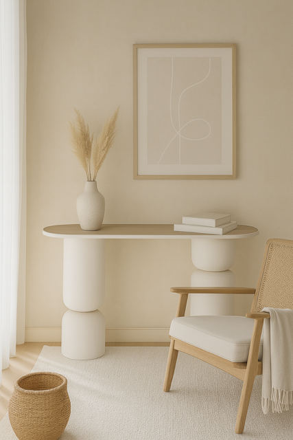 Konsola świetnie komponuje się z neutralnymi odcieniami beżu, szarości i bieli, a także z naturalnymi drewnianymi meblami w odcieniach jasnego dębu czy bukowego drewna. To idealny wybór do wnętrz w stylu Japandi, minimalistycznym oraz skandynawskim, nadając przestrzeni lekkość i harmonię.