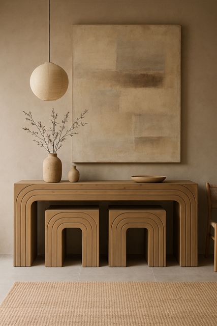 Konsola główna i ławy z zestawu oferują różnorodne możliwości aranżacyjne, doskonale pasując do przestrzeni o różnej wielkości. Ich forma jest przemyślana i wygodna w użytkowaniu, a jednocześnie stanowi subtelną dekorację, idealnie wpisując się w nowoczesne wnętrza.