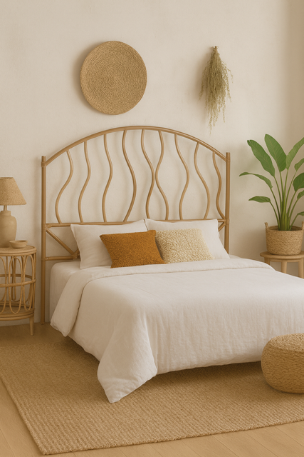 Amae to wezgłowie, które zachwyca prostotą, przestrzenią i subtelną dynamiką formy. Wykonane z naturalnego rattanu, tworzy dekoracyjną strukturę złożoną z delikatnych, promieniście ułożonych linii, które przywodzą na myśl wschód słońca lub otwartą dłoń natury. Jego ażurowa kompozycja nadaje sypialni lekkości i poczucia przestrzeni, wpisując się idealnie w stylistykę japandi, boho, organic modern i coastal.
