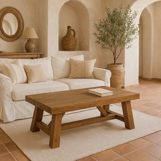 Ława wykonana z litego drewna akacjowego zachwyca surowym wykończeniem i wyraźnym rysunkiem słojów. Charakterystyczne, ukośne wsporniki i masywne nogi nadają jej geometryczną dynamikę oraz wrażenie solidności. To idealny wybór do salonów z sofą modułową, skórzanym narożnikiem lub fotelami w stylu vintage – tworzy stabilne centrum strefy relaksu.