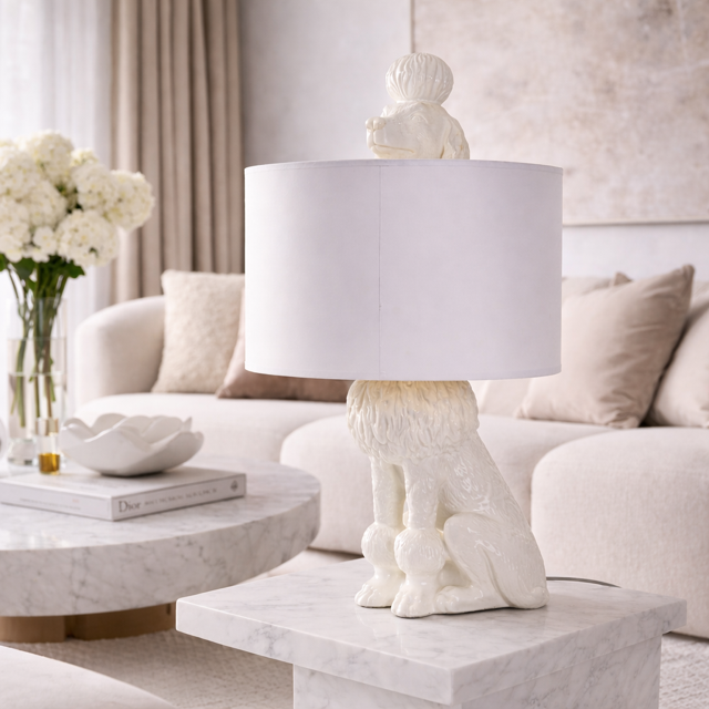 Śnieżnobiała sylwetka siedzącego pudla została starannie odwzorowana z dbałością o każdy szczegół – od tekstury futra po elegancką postawę. Duży, cylindryczny abażur w neutralnym odcieniu subtelnie rozprasza światło, nadając wnętrzu przytulnego blasku. To wyjątkowe połączenie humoru i wyrafinowanej estetyki sprawia, że lampa staje się jednocześnie dekoracją i praktycznym elementem wyposażenia.