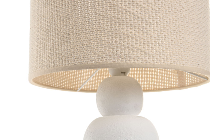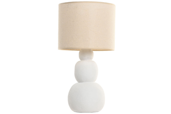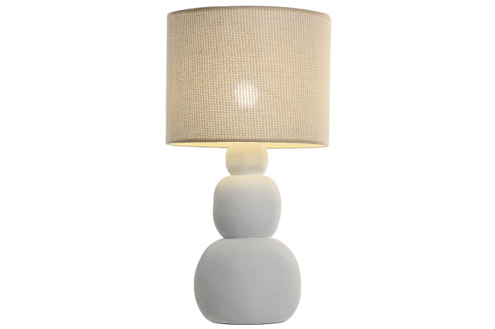 Podstawa lampy, przypominająca ułożone na sobie białe kamienie, wprowadza do aranżacji element spokoju i równowagi. Połączenie organicznego kształtu z prostym materiałowym kloszem sprawia, że całość prezentuje się lekko i ponadczasowo. To oświetlenie staje się nie tylko funkcjonalnym źródłem światła, ale też eleganckim dodatkiem dekoracyjnym, który dodaje wnętrzom indywidualnego charakteru.