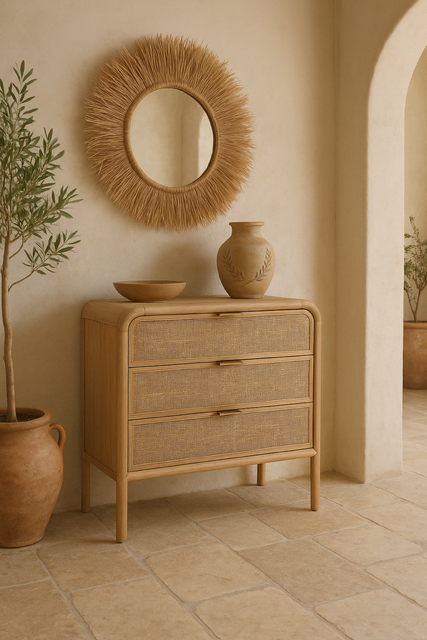 Wyposażona w trzy przestronne szuflady, komoda zapewnia wygodne miejsce na przechowywanie odzieży, tekstyliów czy akcesoriów codziennego użytku. Fronty z naturalnego rattanu dodają jej subtelnej lekkości, a drewniana rama w jasnym odcieniu doskonale komponuje się z naturalnymi dodatkami i jasnymi wnętrzami.