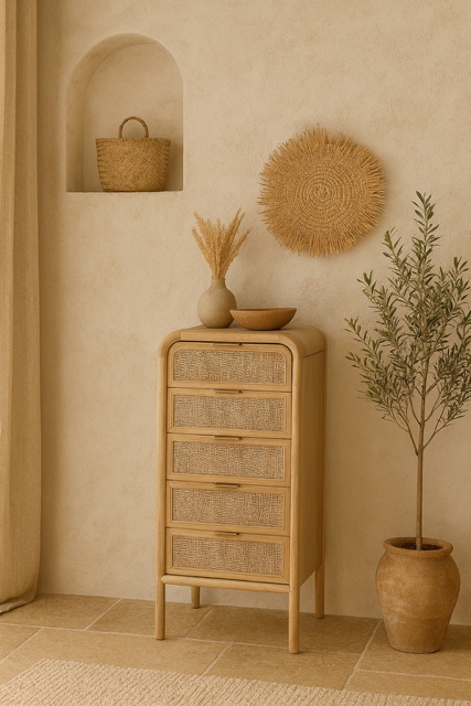 Komoda boho z drewna i rattanu idealnie odnajdzie się w sypialni, przedpokoju czy salonie. Pasuje do aranżacji w stylu boho, japandi, skandynawskim i śródziemnomorskim, tworząc spójną całość z naturalnymi dodatkami, jasnymi ścianami i roślinami w glinianych donicach. Jej kompaktowy rozmiar sprawia, że świetnie sprawdzi się również w mniejszych przestrzeniach.