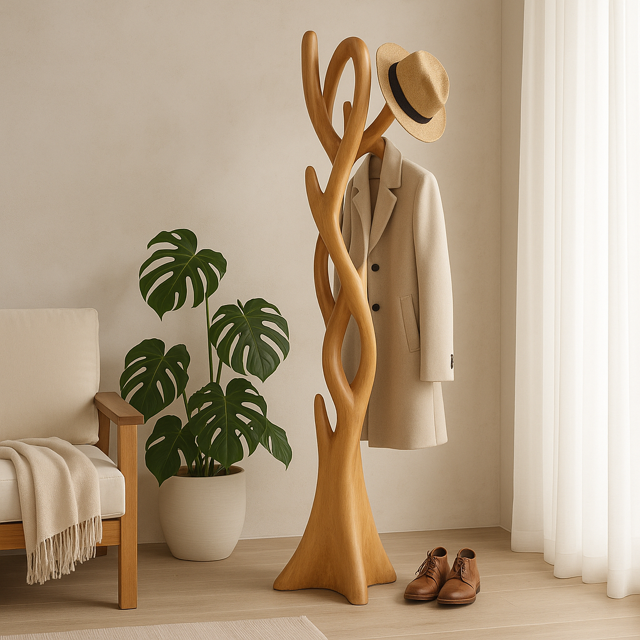 Wykonany z litego drewna suar, zachwyca naturalnym wykończeniem i ręcznie rzeźbionymi liniami, które nadają mu organiczny, unikatowy wygląd. To idealne miejsce do zawieszenia płaszczy, toreb czy kapeluszy, które jednocześnie wprowadza do aranżacji atmosferę ciepła i naturalnej elegancji.