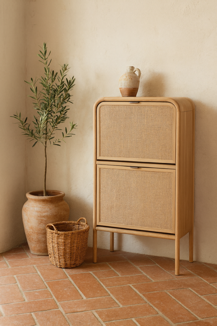 Wyposażona w dwie pojemne, uchylne klapy, szafka pozwala na wygodne uporządkowanie obuwia. Fronty z naturalnego rattanu nadają jej lekkości i naturalnego uroku, a jasne drewno pięknie komponuje się z wnętrzami w neutralnych odcieniach. Dzięki kompaktowej głębokości mebel świetnie sprawdza się nawet w węższych korytarzach.