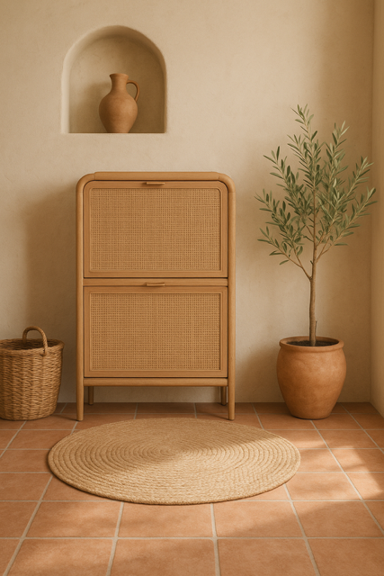 Szafka na buty boho to praktyczny i jednocześnie dekoracyjny element wystroju. Doskonale prezentuje się w przedpokoju, wprowadzając do niego harmonię i porządek. Może też pełnić funkcję dodatkowej szafki w sypialni czy garderobie, gdzie oprócz obuwia pomieści drobiazgi i akcesoria. Jej uniwersalny charakter sprawia, że pasuje zarówno do aranżacji boho, japandi, skandynawskich, jak i śródziemnomorskich.