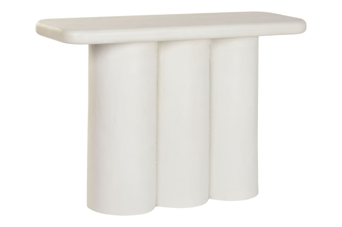 Blat o prostych liniach wspiera się na trzech cylindrycznych filarach, które nadają całości monumentalnego, a jednocześnie lekkiego wyglądu. Ta kompozycja sprawia, że konsola staje się nie tylko praktycznym miejscem na dekoracje, ale również wyrazistym elementem artystycznym.