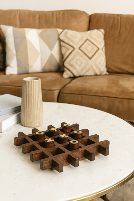 Ta gra to nie tylko plansza do rywalizacji – to także subtelna ozdoba, którą można postawić na stoliku kawowym, w biblioteczce lub na konsoli. Drewniana baza w ciepłym odcieniu brązu i kontrastujące metalowe symbole „X” i „O” tworzą efektowną całość, dodając wnętrzu eleganckiego akcentu. Świetnie sprawdzi się zarówno podczas spotkań z przyjaciółmi, jak i w roli designerskiego dodatku, który budzi zainteresowanie gości.