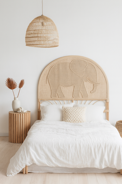 Rattanowy zagłówek egzotyczny został ozdobiony wyjątkowym motywem słonia, który symbolizuje siłę, spokój i harmonię. Jego subtelna plecionka, połączona z naturalnym odcieniem rattanu, sprawia, że całość nabiera lekkości i przyjemnej elegancji. To dekoracyjny element, który zamienia zwykłe łóżko w centralny punkt aranżacji.
