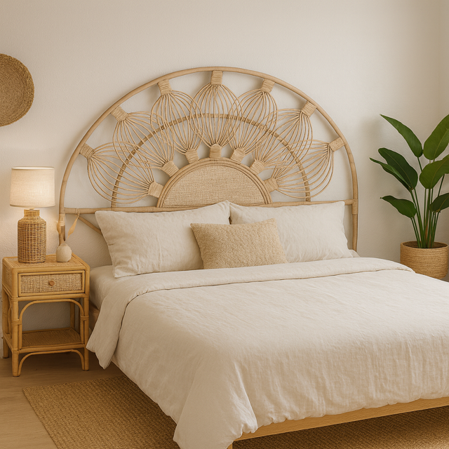 Półokrągła forma z misternie splecionymi rattanowymi liniami przypomina rozchodzące się promienie słoneczne i płatki kwiatów. Dzięki temu zagłówek staje się dekoracyjnym centrum sypialni, a jednocześnie zachowuje lekkość i ponadczasowy charakter. To idealne połączenie naturalnego materiału z artystycznym designem.